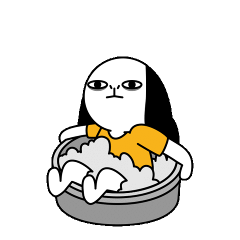 A cartoon character with a neutral expression sits in a bathtub filled with bubbles, enjoying a moment of personal hygiene.