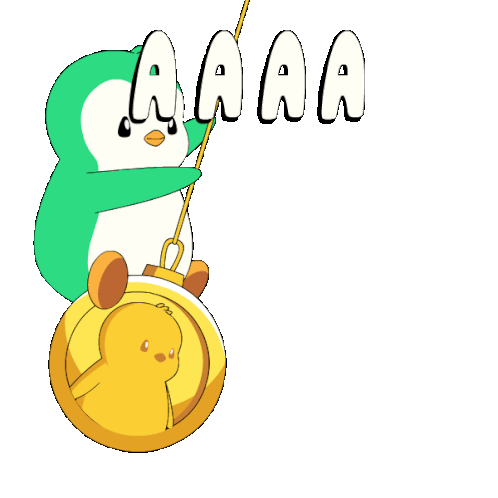 Abster, the green and white cartoon penguin, swings playfully on a large gold coin with 'AAAA' text above.