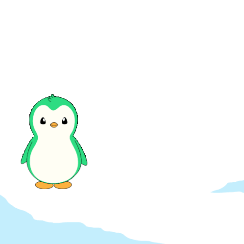 a green and white penguin is standing on a snowy slope
