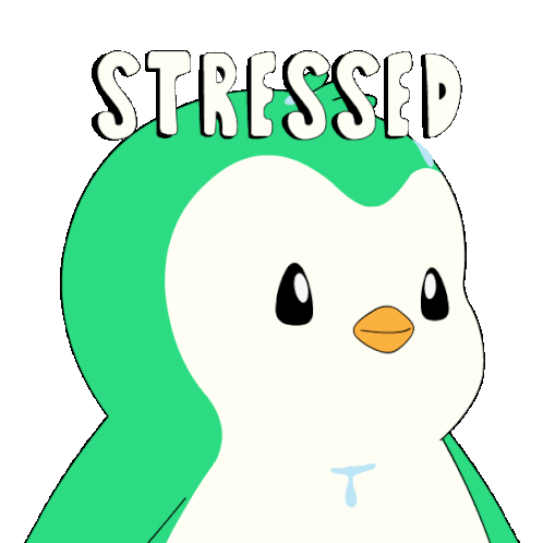 A cute cartoon penguin is visibly stressed and sweating, with the word 'STRESSED' displayed above its head.