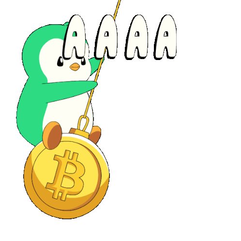 Abster, a cute green and white penguin, swings joyfully on a golden Bitcoin coin with 'AAAA' text above.