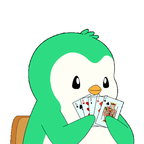 A cute green Abster penguin playing poker, holding a hand of cards, then quickly revealing them.