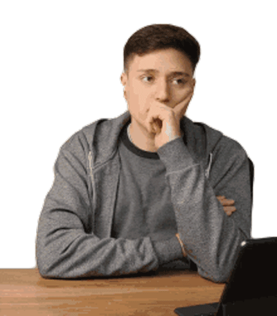 A young man from Suprapixel looks bored and thoughtful, resting his chin on his hand while sitting at a desk with a laptop.