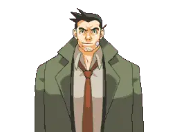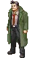 Animated pixel art sticker featuring Detective Gumshoe from Ace Attorney, standing in his signature green jacket.