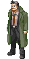 Detective Gumshoe from Ace Attorney is depicted in pixel art, standing in his signature green trench coat.