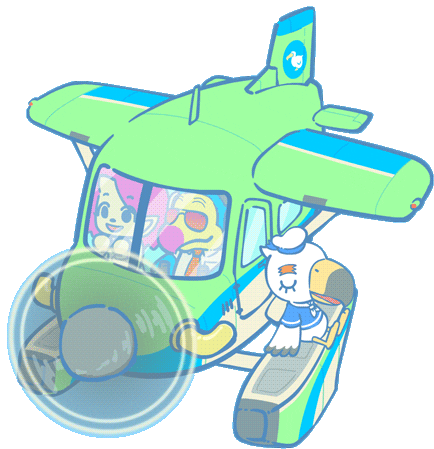 Wilbur the dodo bird stands on a Dodo Airlines seaplane, ready for adventure with the pilot and a passenger.
