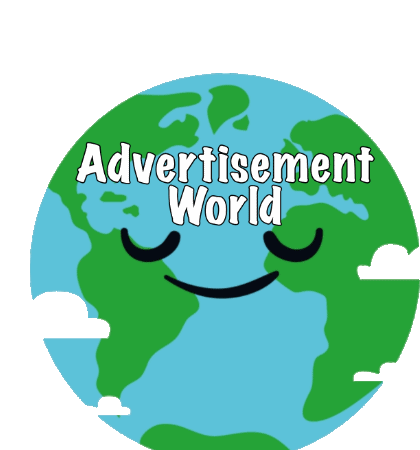 A cute animated sticker of a smiling cartoon Earth with 'Advertisement World' text and clouds.