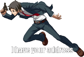 Adachi from Persona 4, a pixel art man in a suit running with a gun, stating "I have your address."