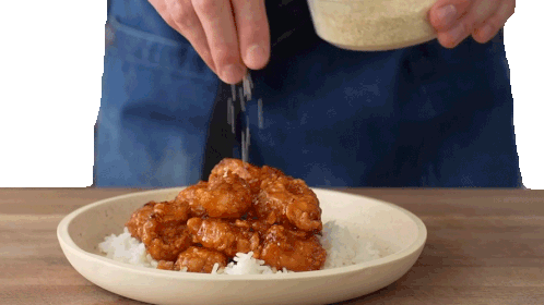Brian Lagerstrom sprinkles white sesame seeds over a dish of orange-glazed chicken and white rice, adding a finishing touch.