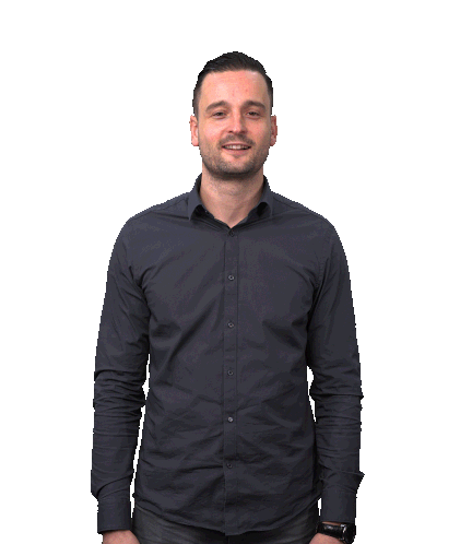 Sander Adriaanse gives a cheerful double thumbs up, smiling brightly in a black shirt, showing approval.