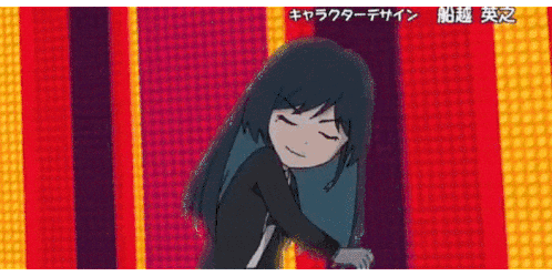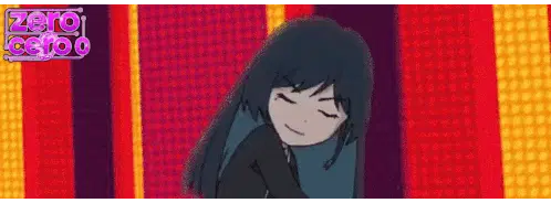 a cartoon girl with long black hair is dancing in front of a red and yellow background