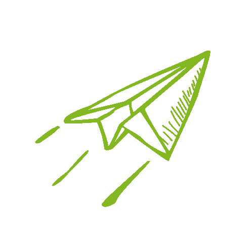 A hand-drawn green paper airplane animated sticker, flying forward with motion lines, associated with Aga Agaplesion.