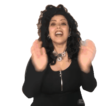 A woman with dark curly hair expresses excitement, clapping her hands and smiling broadly with an open mouth.