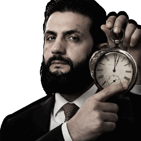 a man in a suit and tie is holding a pocket watch with roman numerals on it