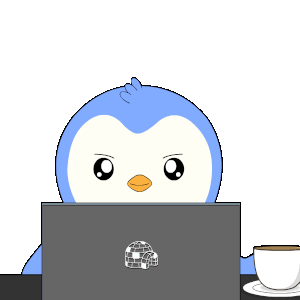 A cute blue penguin, possibly Pengu or Pudgy, intensely focused on coding or working on a laptop with coffee.