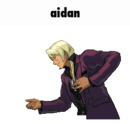 Aidan, a character in a purple suit, performs an animated gesture with his hands.