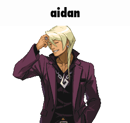 Aidan, an anime character with blonde hair, smiles subtly while stylishly touching his hair, exuding confidence.
