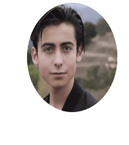 a close up of a young man 's face in a circle with a blurry background