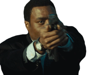 Chiwetel Ejiofor, dressed in a suit, intensely aims a gun directly forward with both hands, ready for action.