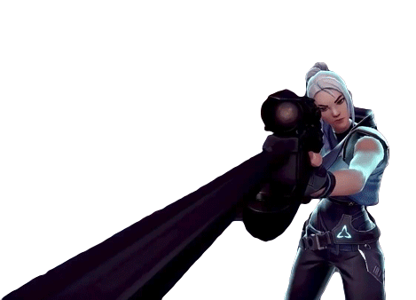 Jett, the agile agent from Valorant, is seen aiming her powerful sniper rifle directly at the viewer, ready for action.