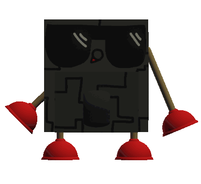 A blocky, dark grey Airfryer Mckool character with red plunger feet and a plunger arm rotates, wearing sunglasses.