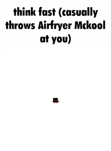 A pixelated Airfryer McKool is casually thrown at the viewer with a 'think fast' warning.