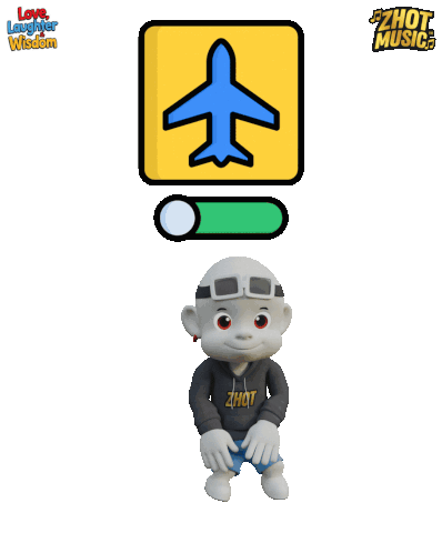 a cartoon character wearing a zhot shirt stands in front of an airplane icon
