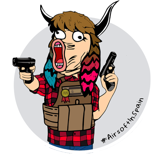 a cartoon of a woman with horns holding two guns with the hashtag #airsoftinspain below her