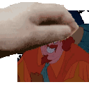 A hand gently pets the head of Alameda Slim, the villainous cowboy from Disney's Home on the Range.