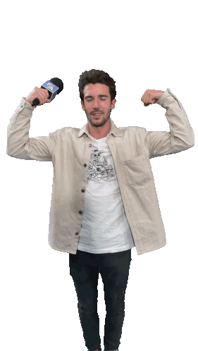 a man is flexing his muscles while holding a microphone that says fox on it