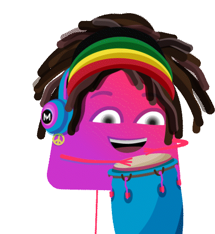 A vibrant pink reggae monster with dreadlocks and a Rasta headband plays a conga drum, wearing headphones.