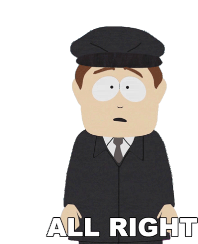A South Park character, possibly Mr. Garrison, stands with hands in pockets, looking surprised as the text 'ALL RIGHT' appears.