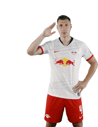Willi Orban of RB Leipzig performs a crisp salute, acknowledging fans or showing respect.