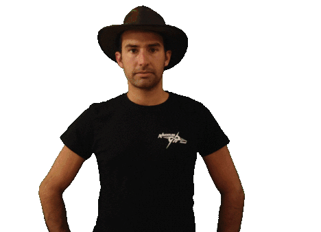 Christian Almansa, wearing a black t-shirt, performs a friendly hat tip, taking off his hat and putting it back on with a smile.