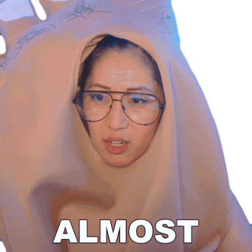Mariko Takahashi (atomicmari) in a hand costume, looking surprised with 'ALMOST' text. Expresses a near miss or close call.