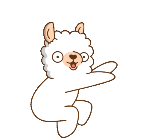 A cute, fluffy white cartoon alpaca with big eyes happily dances and moves its arms in a cheerful animated sticker.