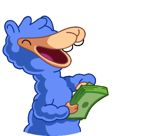 A cheerful blue alpaca-like creature happily fanning and holding a stack of green money bills.