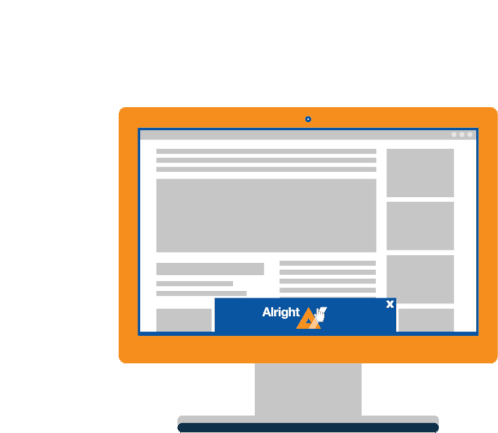 An animated sticker showing an 'Alright Ads' pop-up ad appearing on a desktop computer screen, then being closed by a mouse cursor.