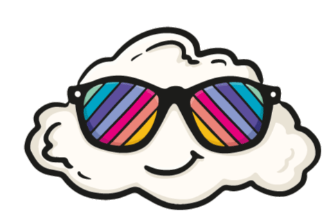Amdocs amazing cloud character wearing cool black sunglasses with vibrant rainbow-striped lenses and a happy smile.