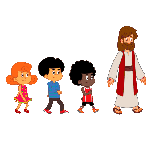 An Amém sticker showing Jesus walking happily with three joyful children, who raise their arms in celebration.