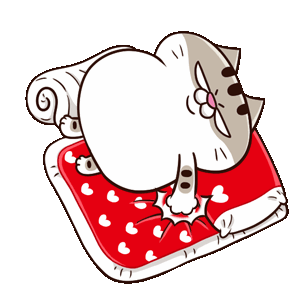 Ami the fat cat lies on a red bed with hearts, patting it with a paw, seemingly demanding attention or inviting someone to come closer.