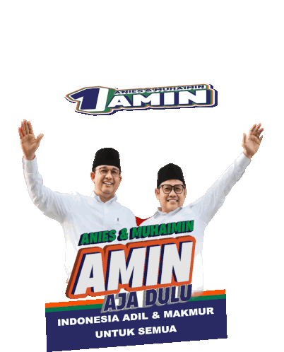 two men are standing next to each other with their arms in the air and a sign that says amin