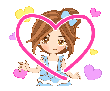 An animated cartoon girl with brown hair and a blue dress forms a heart, then is surrounded by floating hearts.