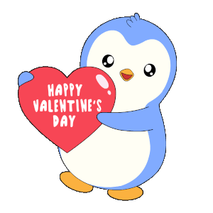An adorable blue and white penguin holds a red heart with 'Happy Valentine's Day' written on it, wiggling happily.