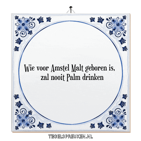 a blue and white tile with the words wie voor amstel malt geboren is zal nooit palm drinken on it