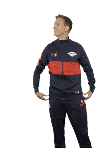 Julian Nagelsmann, wearing a Red Bull tracksuit, smiles while adjusting his jacket.
