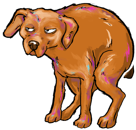 A cartoon brown dog with a grumpy expression in the act of shitting, reflecting a humorous or rebellious mood.