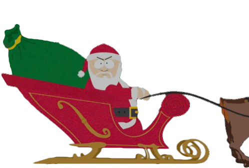 Angry Santa Claus, from South Park, rides his sleigh with a grumpy expression, ready to deliver gifts.