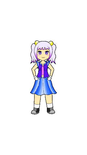 A cute anime girl with purple hair and yellow hair accessories dances, wearing a blue pleated skirt and a purple vest.
