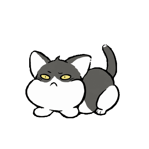 A cute, chubby gray and white cartoon cat with yellow eyes lies down, looking annoyed and pouting with a grumpy expression.